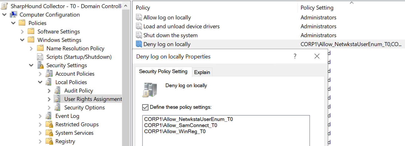 For example, if our Tier Zero SharpHound collector gMSA is a member of the Allow_SamConnect_T0 group, a GPO configured like this and linked to the Tier Zero OU where all of the non-DC Tier Zero assets are located, SharpHound will be able to collect Local Group data from those hosts.