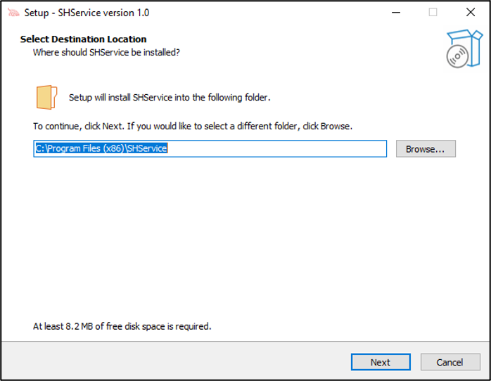 - Choose where to install the service and click Next. We recommend a path protected from low-privileged user writes such as the default “C:\Program Files (x86)\SHService”.